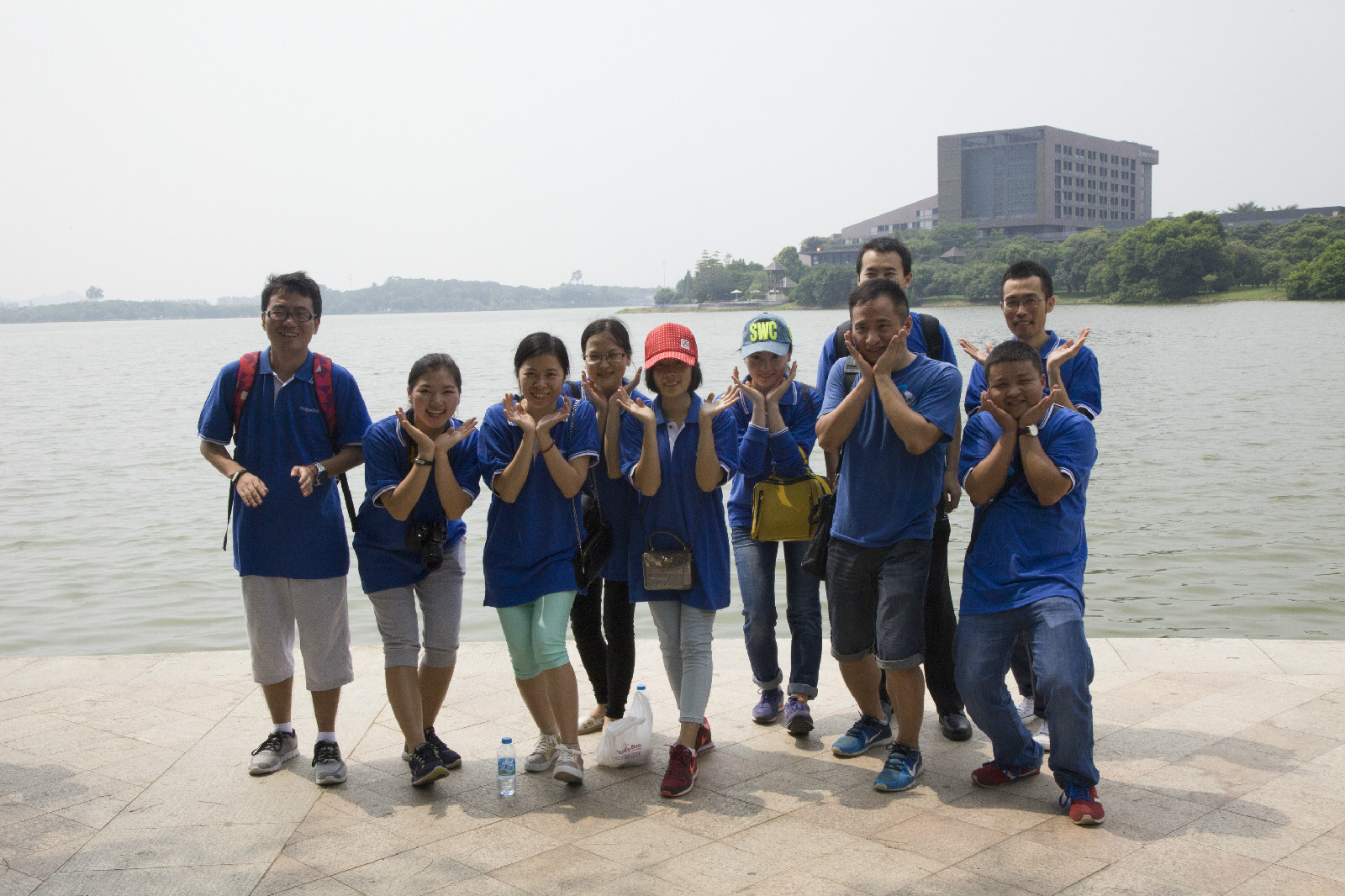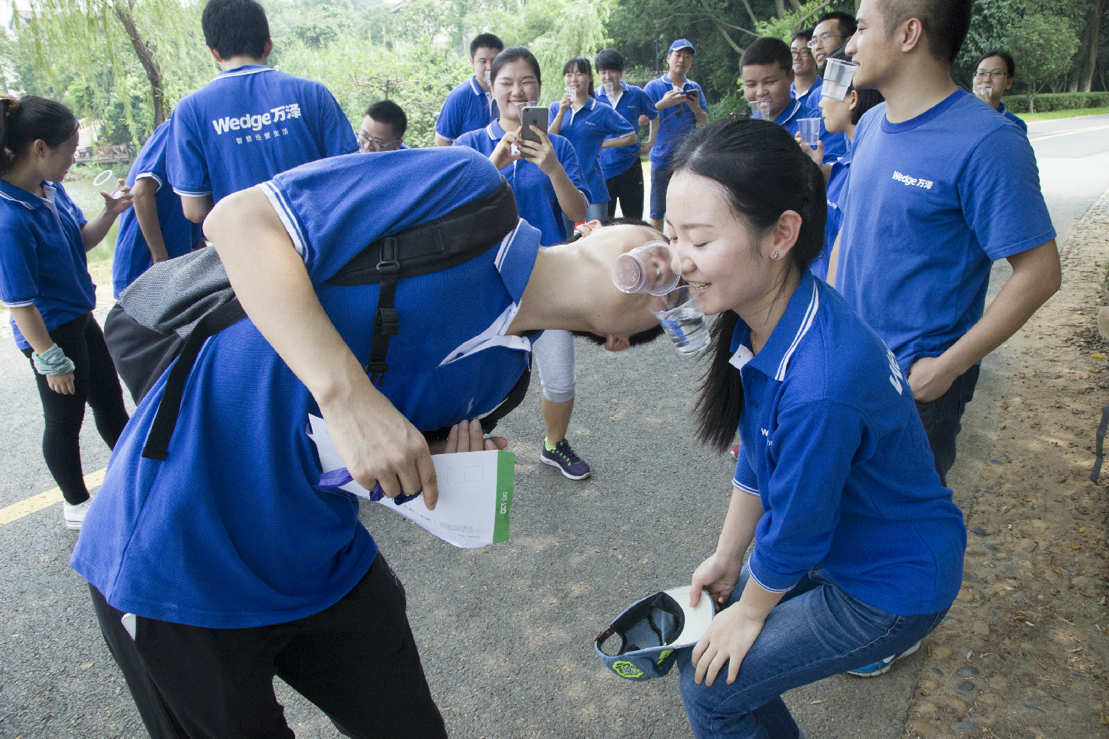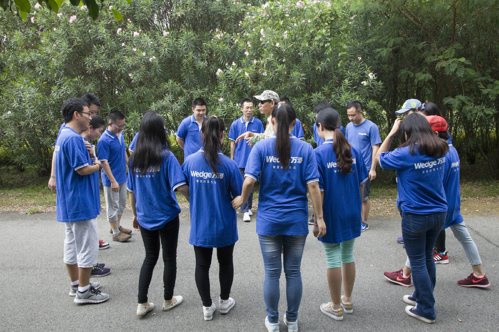 早晨8点30分,万泽集团工会的青年会员们统一身穿公司蓝色文化衫,统一乘车前往拓展基地——东莞松山湖风景区。到达目的地后,在拓展公司专业教练的带领下,首先开展了团队破冰——男女青年会员“天使和仆人”游戏,让参加活动的男女队员建立相互信任关系,全身心参与到联谊活动中来。在教练的指导下,全体队员男女搭配,分为两个小队,分别进行了口号、队歌和队形设计和形象展示。随后,由各队长向教练领取《定向穿越任务书》,分别组织队员开展了桃花岛“衔杯传水”、珍稀特果园寻找果树、前往虹桥“穿越封锁”、荷香水榭“七巧板”、烟雨亭与“43码大脚”的游客合影、阳光沙滩蜈蚣行走、黄金竹海“最后缘分”等趣味活动。